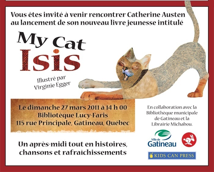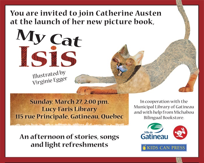 So if you’re in the National Capital Region this weekend, drop by the launch. (And if you can’t make it, be sure to check out My Cat Isis from Kids Can Press.)