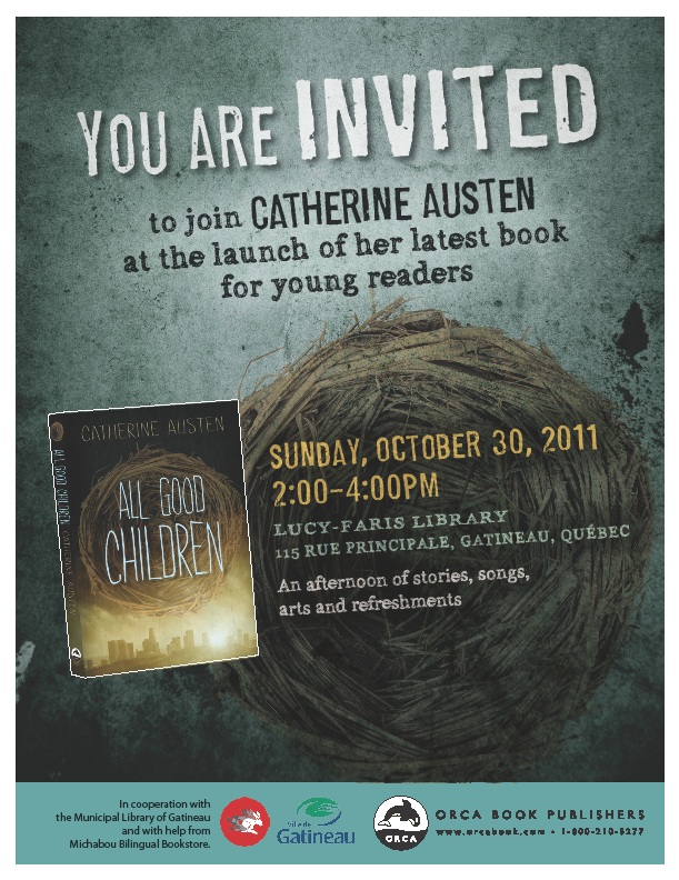 Writers, readers, book-buyers, teens and tweens in Canada’s national capital region on Sunday, October 30th, head over to Aylmer (Gatineau, Quebec) to celebrate the release of my two fall titles: 26 Tips for Surviving Grade 6, a middle-grade comedy from Lorimer, and All Good Children, a teen thriller from Orca.