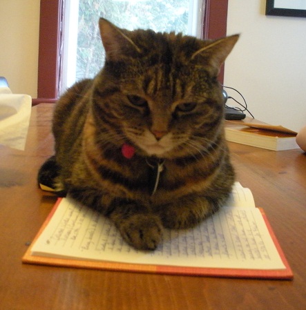 cat on journalEventually, one day when you’re hanging out at your cat-friend’s place, you’ll open a book and the cat will walk over and lay on it, right at the spot where you were reading. So you’ll get up to make a cup of tea and the cat will race in front of your feet, right in the spot where you’re walking. Then you’ll pour milk in your tea and the cat will stick its face right in your cup. And you’ll come to see that cats are not evil, just annoying. And that’s progress.