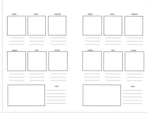 I prefer to make the boxes by hand; I like the messiness of it. But you can create a template on your computer (and say, hand it out to your class if you’re a teacher, so everyone can participate in Inktober). Here’s what one side of that page might look like, unfolded. Feel free to print and copy it, double-sided, to make your month’s journal.