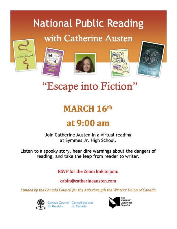 April 2021 Update: The readings listed below have passed, but I have one more National Public Reading coming up on June 9th, hosted by the Muskoka Authors Association, about writing for children and adults. Many thanks to the Canada Council for the Arts and the Writers Union of Canada for the NPR Program.