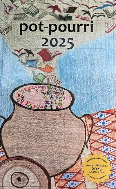 You can read their stories — and fifteen other winning pieces — in Pot-pourri 2025. They are exemplary. (I use Pot-pourri when I teach creative writing to elementary and high schools students. The contest is important not just for the winners, or even all the entrants, but for all young people to see what writers their age are capable of.)