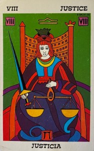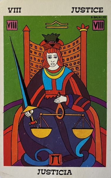 In many decks, Justice is not #8 of the major arcana. Some decks have Strength as #8 and Justice as #11 — blame the Golden Dawn cult for that silliness; they wanted to postpone justice and they probably had reason. The traditional Marseilles deck features Justice as #8, so my Balbi deck does too. And there’s something about justice that just goes with the number, the figure eight in the Arabic system, the way that if you trace that figure, what goes around comes around.