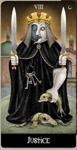 There are decks where Justice is blindfolded but in my deck, she’s not. It’s one of the most striking things about her. Justice is not blind. She stares right at you. You’ve got to look her in the eye. You can’t hide anything from her. You’re pretty sure she knows everything, and she knew it before you even got here.