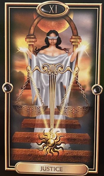 Ponder the meaning of Justice, but go beyond the card itself to imagine a place where judgments are handed down. This setting can look like the open-air court in my tarot card — tarot-lovers with another deck can use their image to inspire their setting — but it doesn’t have to resemble any card. Imagine whatever courtroom excites you.