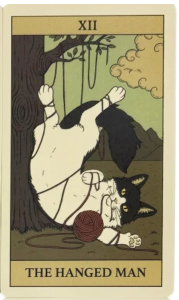 The Hanged Man is one of my favourite tarot cards. I’ve seen it interpreted in a dozen different ways, which attests to its strangeness. Some say it indicates a happy surrender; some say it means you feel trapped. Some say it’s a warning that you need to pause and think deeper. Some say it’s a reminder that you simply have to get on with the boring tedious work that must be done. Who doesn’t like a card so rich in possibility? It’s the image — that patient hanging — that calls to people. It says: Surrender. But exactly what The Hanged Man is surrendering to is not clear.