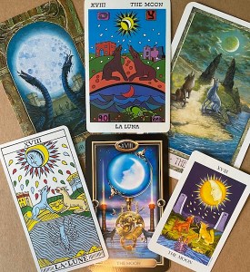 The moon shines brightly but the land is only dimly lit. Both full- and quarter-moon are shown in most cards, reminding us that the moon has many faces and we don’t always see it clearly. It’s not what it seems to be.