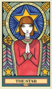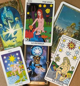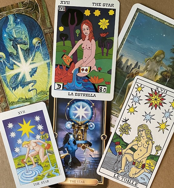Typically, the card depicts a naked white woman at a shoreline, pouring water from two vessels into a pond/river/sea. It’s night and there are stars in the sky, including one especially bright star. But you get the feeling that it’s the woman who’s the real star.