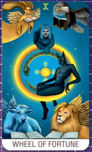 The Wheel of Fortune looks different in every deck. My card keeps a classic theme of beasts around a wheel, their heads pointing in all directions. They rise from darkness into light, sink from light into darkness.