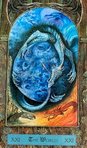 The World is a happy, triumphant card. It says that everything is in balance and all is as it should be. The card signifies a return to the original divine state, the state of enlightenment and purity sought by all religions. It represents the endless renewal of nature and the soul’s incarnation in earthly paradise. It is unity and perfection; there’s nothing missing here.