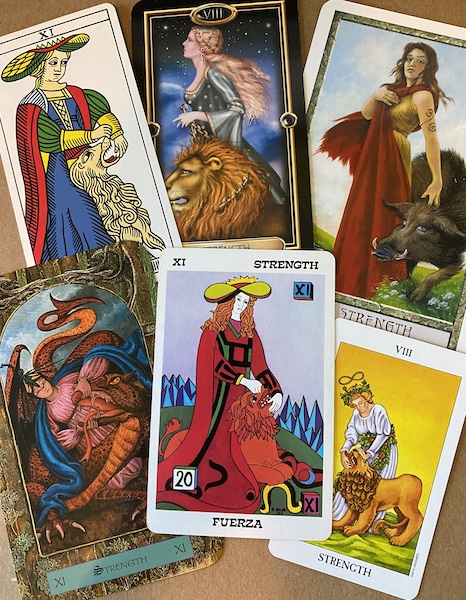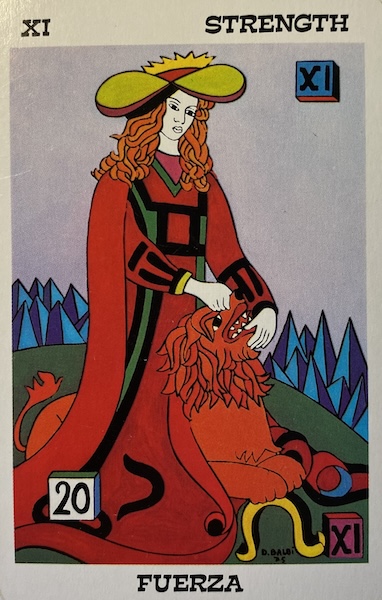 In some decks, Strength is #8 of the major arcana (blame the Golden Dawn cult for that — maybe they needed strength early to control their impulses), but the traditional Marseilles deck features Strength as #11, so my Balbi deck does too.