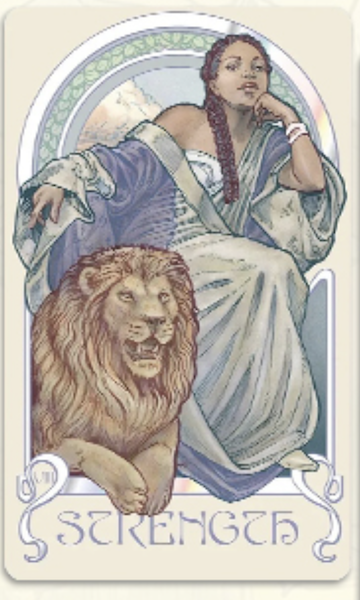 Strength typically shows a woman gently overpowering a lion. Strength is not just the woman; it’s the woman with the lion, the relationship between them. In my card, they share the same colour hair/robes and fur, which suggests their close relation. Together they depict the meaning of Strength.