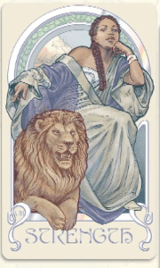 Many decks show the woman beside the beast, but my card shows her on top of the lion and opening his jaws. The way she subdues him suggests domestication — once tamed, he might serve her and her wishes. She’s a little more domineering than I care for — but perhaps her beast is especially strong and difficult to control. She does what must be done.